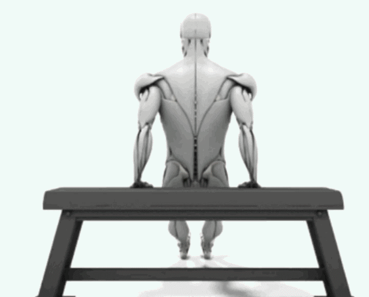然后保持身体背对凳子,双手撑于凳子边缘,使双腿向前伸直或屈膝均可(伸直双腿难度更大)。