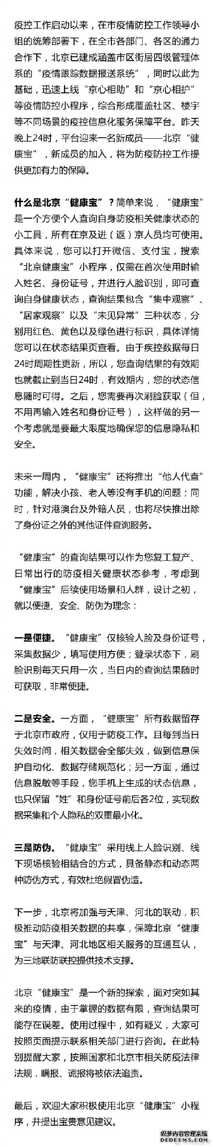 在北京市新型冠状病毒感染的肺炎疫情防控工作新闻发布会上,北京市经济和信息化局副局长潘锋介绍,北京"健康宝"已经上线,"健康宝"是一个方便个人查询自身防疫相关健康状态的小工具,所有在京及进(返)京人员均可使用。详情戳