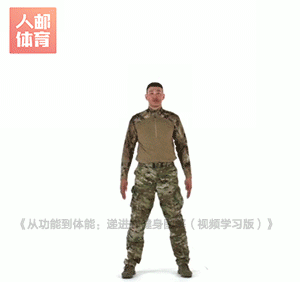 - 双脚向上跳起,同时在身前抬起左腿,并用右手触摸左脚脚踝。