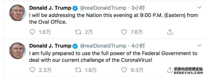 详细情况如下:据外媒报道,美国总统特朗普宣布,他将在美东时间11日晚9点发表全国电视讲话,阐述政府对新型冠状病毒的应对。特朗普在社交媒体“推特”上说,“我将在晚上9点(美东时间),在椭圆形办公室发表全国讲话。”