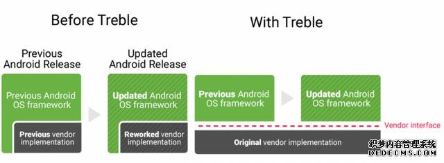 Project Treble机制的核心是,Android硬件厂商的定制UI框架与系统底层框架分离,从而确保所有Android手机都能有一个通用底层框架,而Android硬件厂商在为老设备适配新系统时也能明显缩短所用时长。Google表示,Project Treble机制的引入让Android 9系统的普及速度提升了2.5倍。