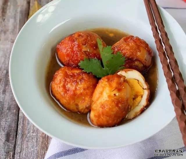 3.炒锅留少许底油,下葱姜爆香,把鸡蛋放入锅中,倒入生抽、料酒、醋、糖、开水烧开转小火焖至入味,加少许盐调味大火收汁装盘,撒上少许香菜末点缀即可
