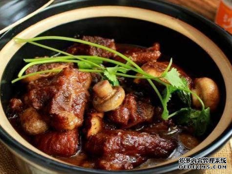 7、高压锅压熟后,待自然冷却,把牛腩倒入煲里。加入口蘑,小火,慢慢的煨,直至口蘑熟了。汤汁收浓了。即可根据口味调入适量盐。汤汁可以留点,拌饭特别好