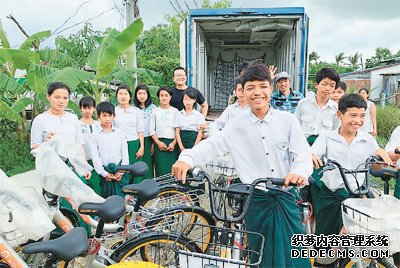 缅甸创业者迈克(左七)将废弃共享单车回收,捐赠给仰光的贫困学生。 |