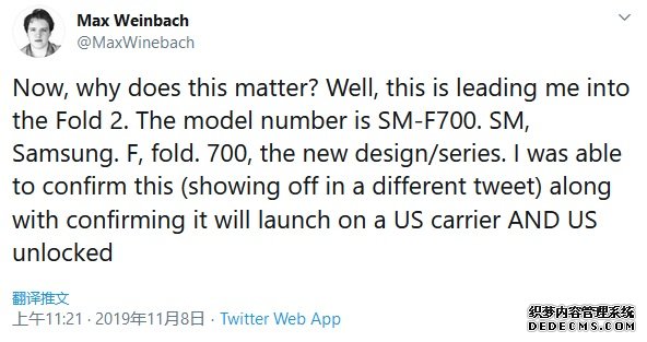 爆料人Ishan Agarwal在社交网站上表示,新款三星Galaxy Fold系列折叠屏手机(“SM-F700”)将具有紫色配色。