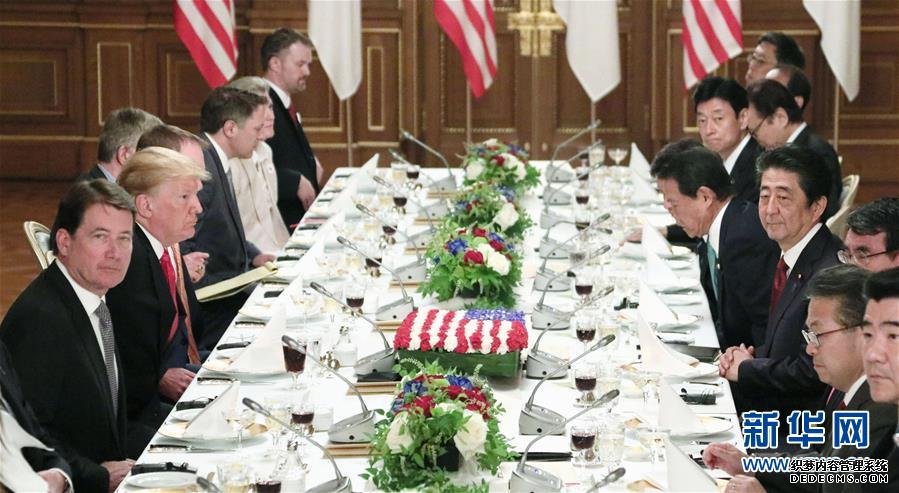 5月27日,在日本东京,日本首相安倍晋三(右四)与美国总统特朗普(左二)举行工作午餐。新华社/共同社