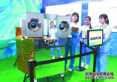 2019年全国科技活动周暨北京科技周主场活动现场,几位学生在观看“风云四号”卫星模型。陈晓根摄/光明图片